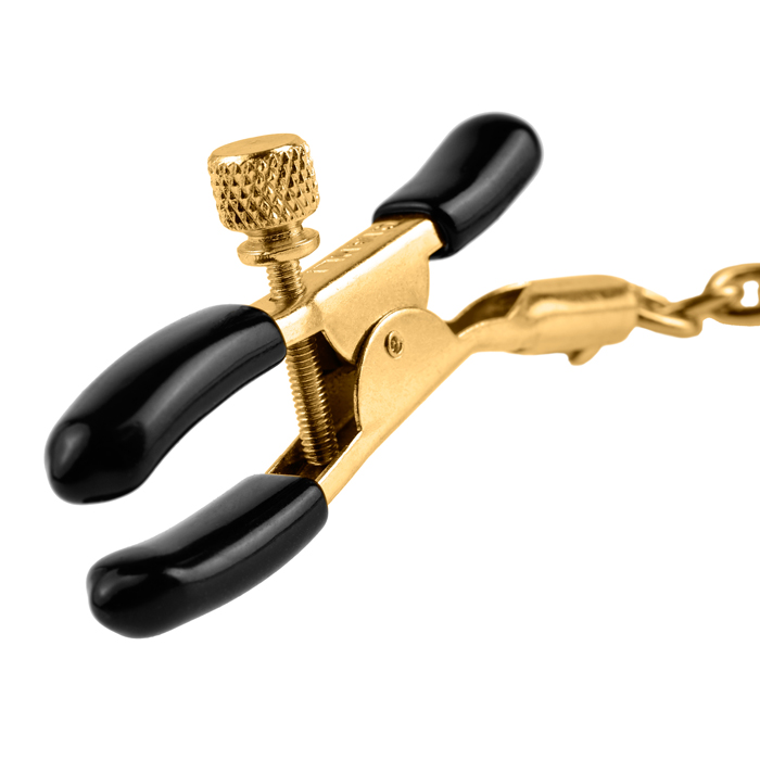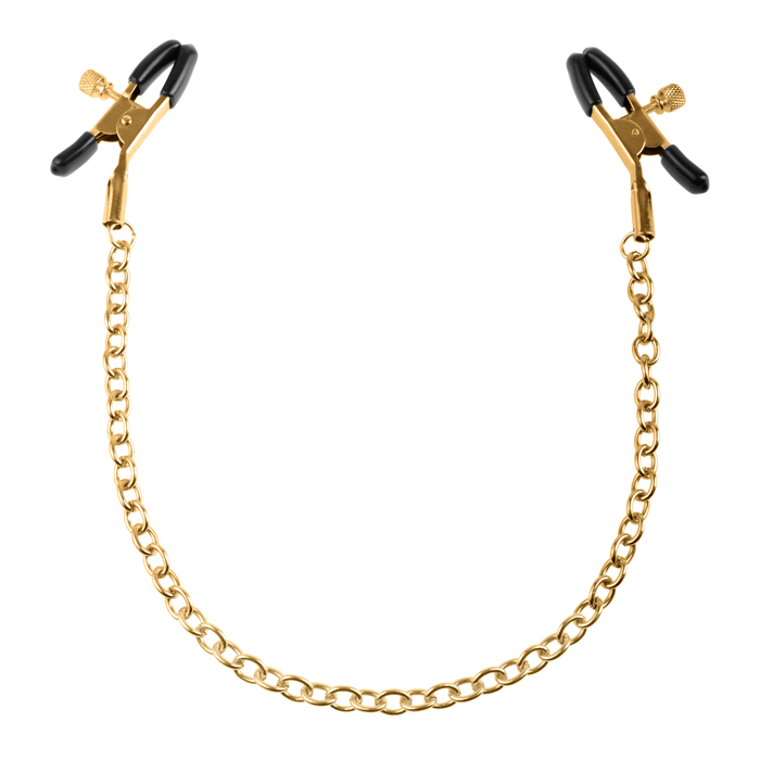 Make your nipples perk with pleasure with these elegant Nipple Clamps. Made with durable metal clips and covered in soft rubber liners for exceptional comfort, these clamps are perfect for beginners and fetish enthusiasts alike. The amount of pressure you apply to the nipple is adjustable using the stem screw. With each movement of the chain, the clamps gently stimulate your nipples for incredible sensations.