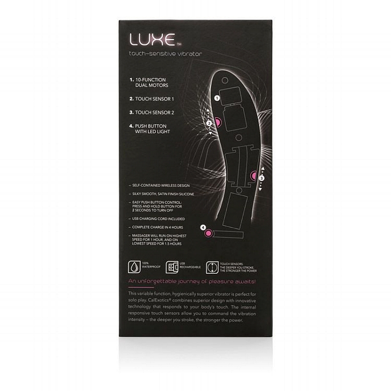 Take full control of your sensual pleasure with the innovative Luxe Touch-Sensitive Rabbit. This technologically advanced vibe boasts dual sensors along the shaft that intensify the power as they are activated, plus dual motors for total arousal. With 10 powerful vibration, pulsation and escalation functions, two ultra sensitive touch activated sensors and a USB rechargeable charging cord included, this exceptionally designed pleasure device will leave you wanting more, more, and oh yes…even more!