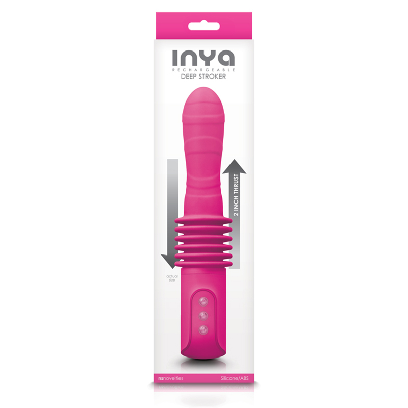 “The Deep Stroker by INYA features a longer range of motion for profound thrusting and intense vibration for explosive orgasmic pleasure. This powerful and rechargeable vibe is made of body safe silicone and is suitable for use with all lubricants. In N out, Up N Down – the Deep Stroker by INYA. “