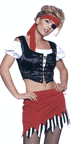 5 Piece Pirate Costume set includes pirate peasant top, pirate corset, pirate skirt, pirate bandanna and pirate eye patch. Leg Avenue