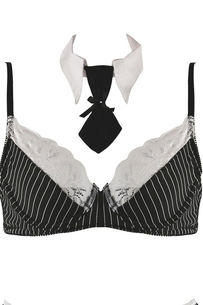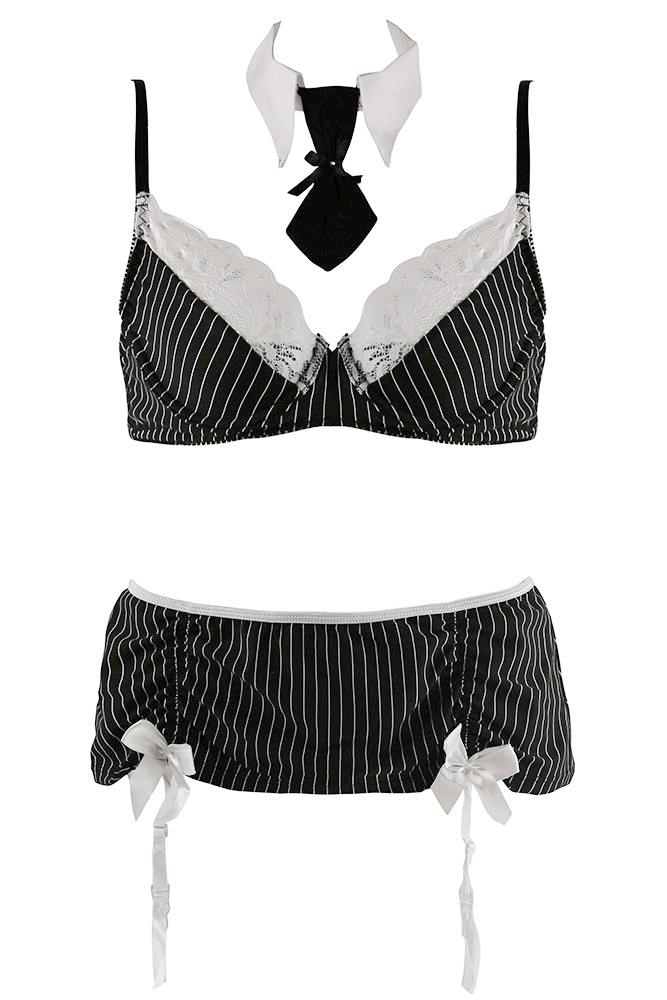 The classiest of lingerie sets exuding utter sex appeal and sheer confidence, the Sexy Secretary Set is Baci’s stripped-down approach to formal business attire from the Dreams Collection, and my, is it ever hot? The three piece role play outfit includes a standard bra top, a matching gartered mini skirt and a Velcro, collared neck tie set in an office-appropriate pinstripe pattern, boasting model grey and white hues with sharp black accents. The demi-cup bra is overlain with gorgeous, white floral lace panels, perfectly complementing its crisp white collar while securing at the back with a traditional bra clasp and adjustable shoulder straps. With an ultra-short, flesh-baring hem, the minuscule skirt is absolutely jaw dropping, crowing sweet white bows atop each adjustable garter strap for a playful and feminine appeal. To complete the look, simply attach a pair of sexy black thigh highs to its four garters and slip on an irresistible pair of heels.