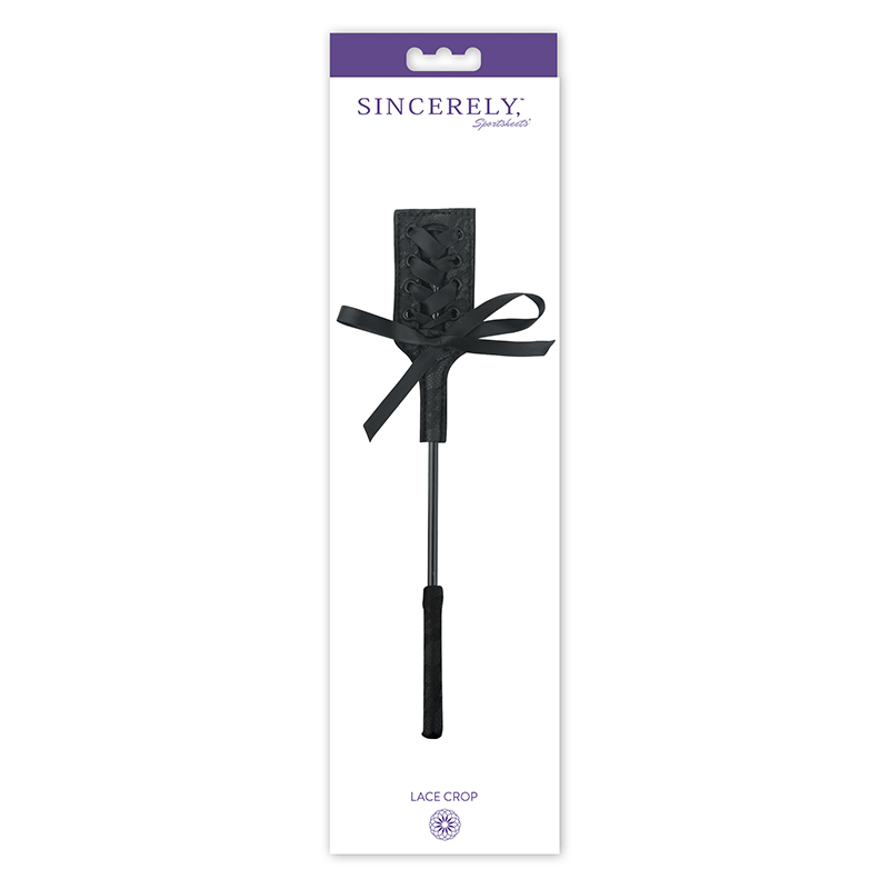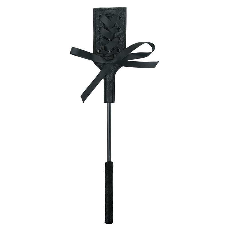 Covered in a luxurious lacy fabric, the head of this stylish, sleek crop is set off with a lavish black corseted ribbon and satin bow. The stem is made of a thin yet sturdy rod. The handle is covered at the base with the same lacy fabric