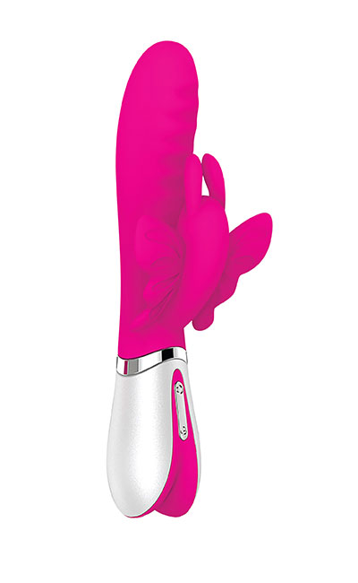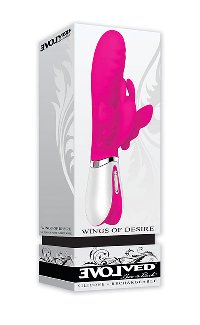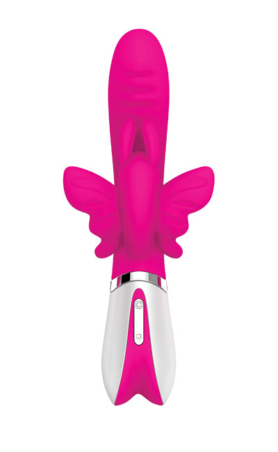This dual motor silicone vibrator lets you take flight on a journey to pure bliss with wings that flutter and buzz at the perfect pace to put you right over the edge. Sensation ridges on the underside of the shaft give you an added push, while the seven functions let you control the intensity and pattern of your experience with a no nonsense one touch control.